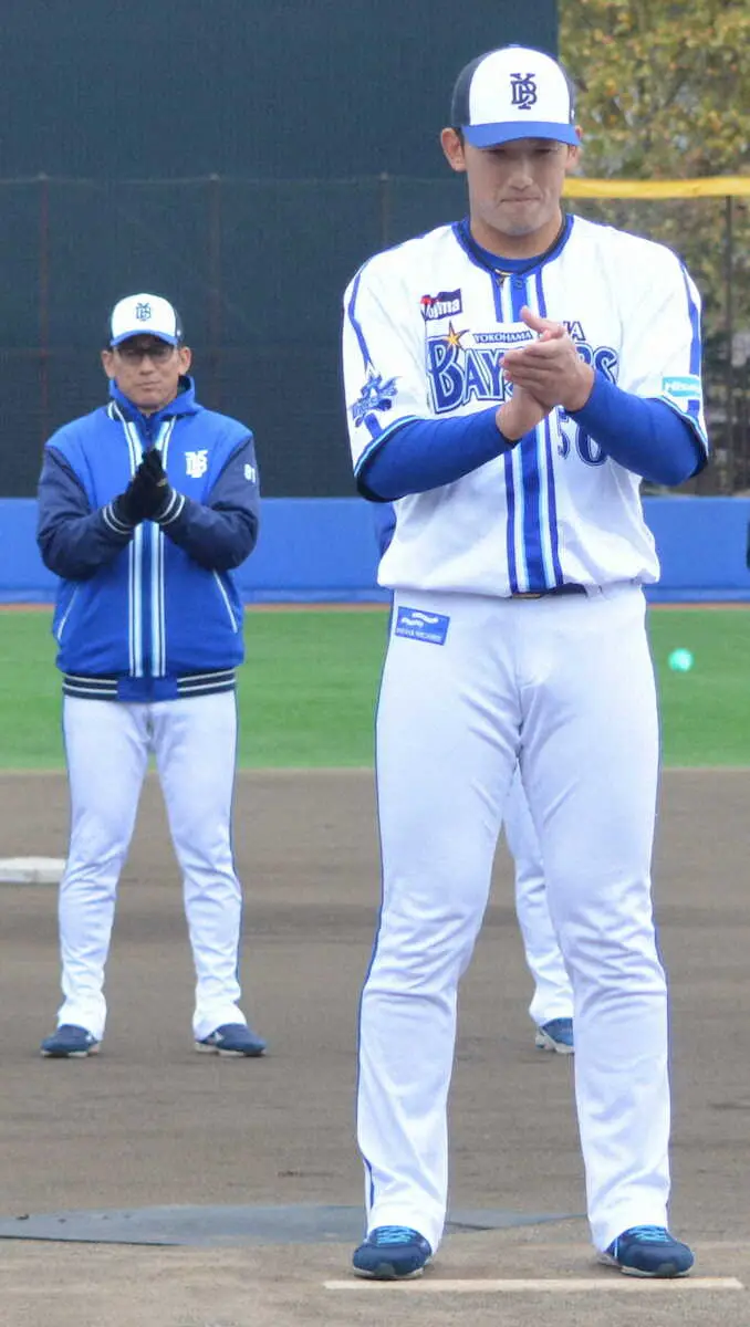 秋季トレーニング終了の手締めをするDeNA・山本と後方の三浦監督(左)