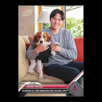 同カード発売は毎年恒例だが、今回は「打者・大谷」の通常版に加え、受賞発表時に脇に抱えていた愛犬のコーイケルホンディエ犬とのツーショット写真版の2パターンが用意された。24時間限定で日本時間19日午前6時30分まで販売。1枚1243円から購入できる。
