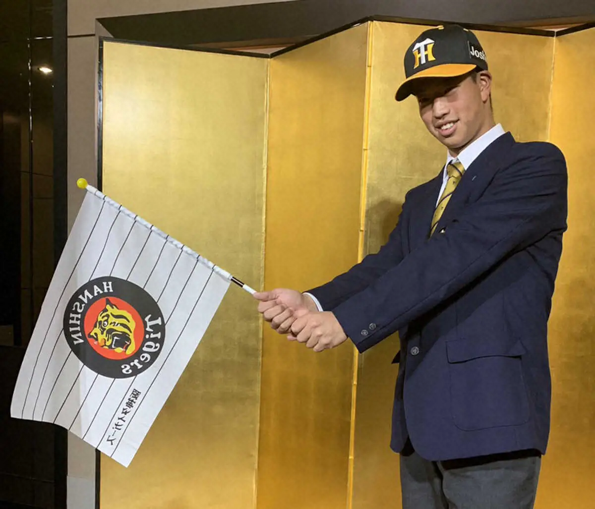 阪神と仮契約した東海大熊本星翔・百崎(撮影・松本 航亮)