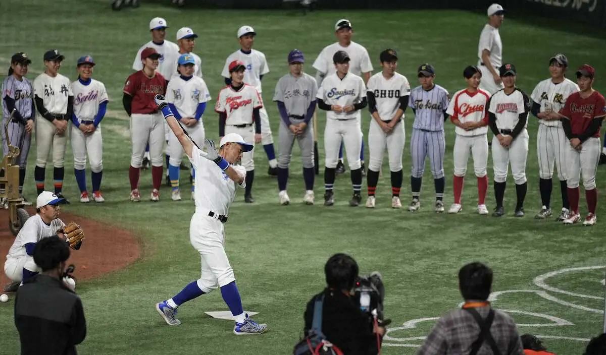 <イチロー選抜・高校野球女子選抜>試合前、高校野球女子選抜ナインの前でティー打撃を披露するイチロー氏(撮影・沢田 明徳)
