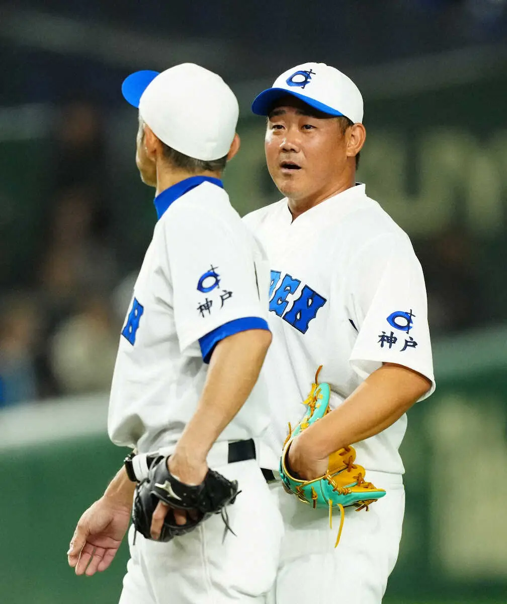 <高校野球女子選抜・イチロー選抜>2回、ピンチを迎えた先発・イチロー氏(左)に声をかける松坂氏(撮影・島崎忠彦)