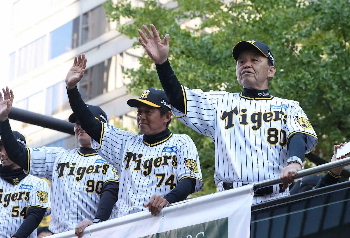パレードを終えた岡田監督は「天気が良かったね。手を振ったので両肩、疲れてます。『ありがとう』という声が多くて、1年間やりきったんだな、本当にやったんだなと思った。きょうの御堂筋は近かったね。甲子園の4万5000人とはまた違う雰囲気やった。タイガースファンが結集して、全タイガースファンの声を聞いた。そんな感じ」と話した。