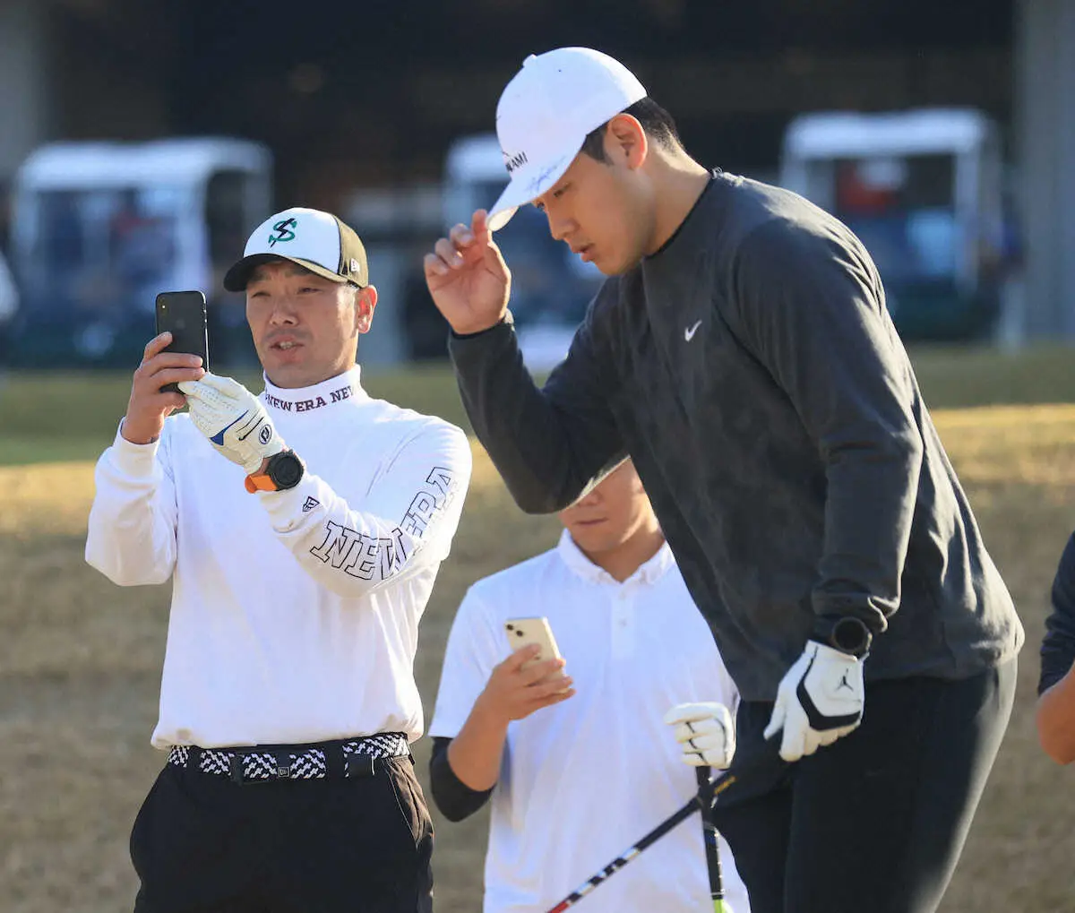 岡本和(右)のティーショットをスマホで撮影する阿部監督(撮影・尾崎 有希)
