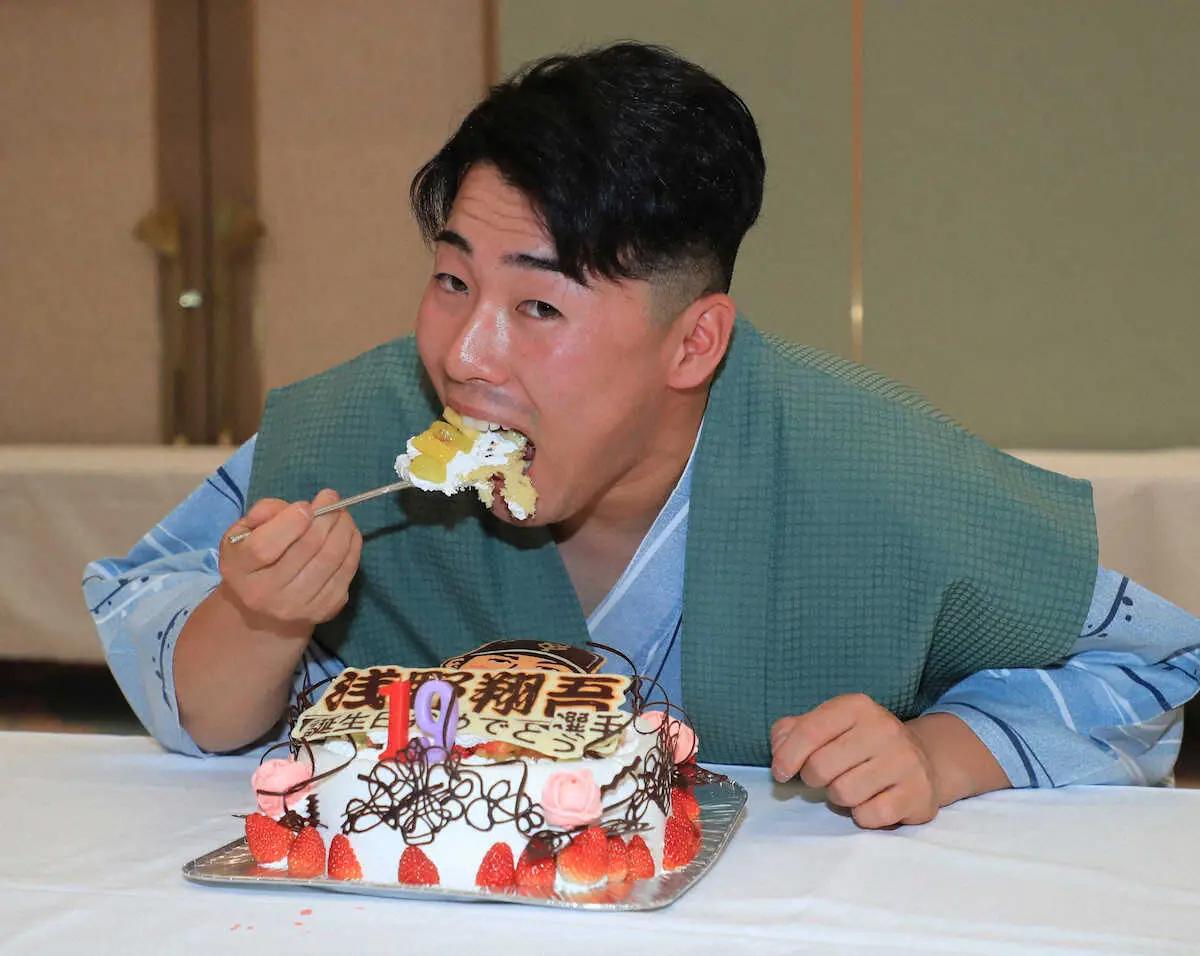 ドラフト1位で入団して1年目を終えた巨人の浅野が19歳の誕生日を迎えた。納会会場のホテルで似顔絵入りの特注ケーキを頬張り「めっちゃおいしいです」と笑顔を見せた。