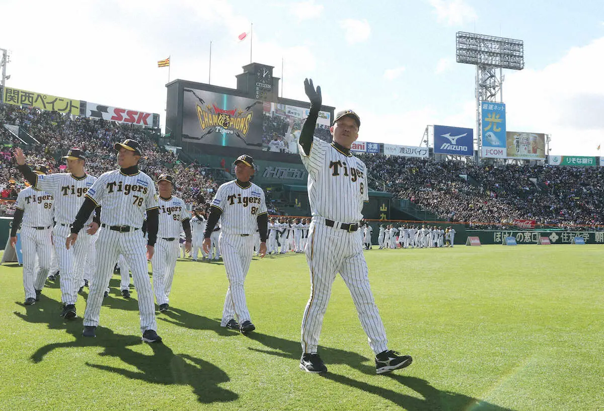 ファン感謝デーで大勢のファンに手を振りながら入場する阪神・岡田監督(右端)(撮影・大森 寛明)