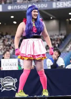 選手がコスプレで変身する企画「全員で対決!ファン参加型 5番勝負 COOL vs CUTE」のトップバッターとして野口が「推しの子」に登場する星野アイに扮して登場。薄いピンクのフリフリドレスに1メートル81、90キロの巨体を包んで登場。無敵の笑顔で会場に爆笑を巻き起こした。