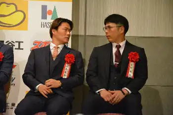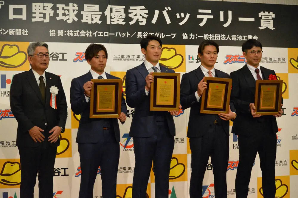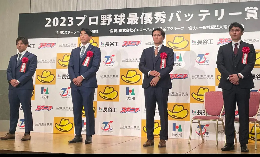 <2023年度プロ野球最優秀バッテリー賞授賞式>最優秀バッテリー賞を授賞し、フォトセッションに臨む(左から)DeNAの山本、東、オリックスの山本、若月(撮影・木村 揚輔) Photo by スポニチ スポニチ制定最優秀バッテリー賞表彰式 オリ山本―若月、DeNA東―山本が出席 ギャラリーで見る この記事のフォト 2023年11月27日の画像一覧 もっと見る 2023年11月27日の画像をもっと見る