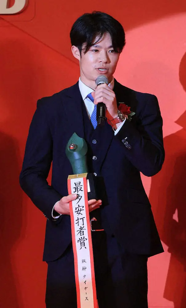 盗塁王に輝いたルーキーイヤーの21年以来、2年ぶりに阪神・中野が「NPB AWARDS」へと帰ってきた。シーズン164安打を放ち、牧(DeNA)と同数で初の最多安打のタイトルを獲得。バントや進塁打など、制約の多い2番打者で栄冠をつかみ「縁のないことだと思っていたので、素直にうれしい」と笑顔を浮かべた。喜びもそこそこに、来季のターゲットを首位打者に定めた。