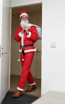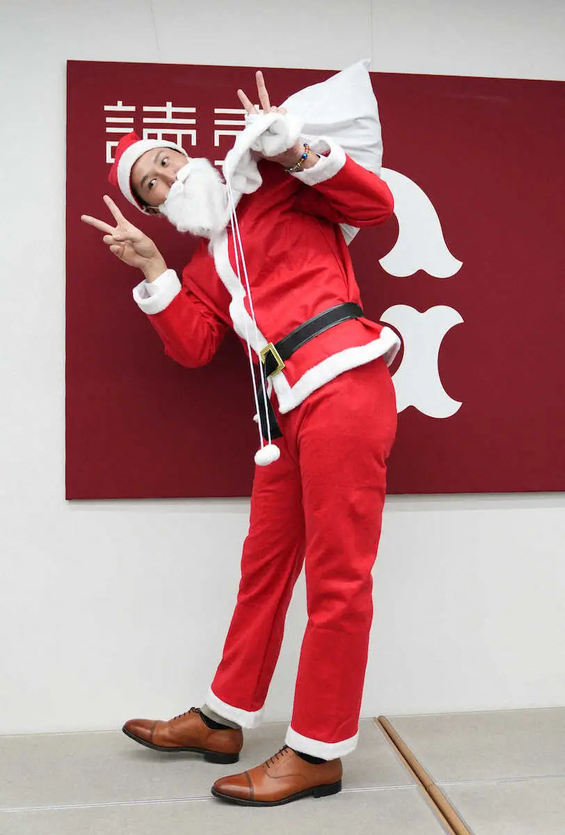 <巨人契約更改>大幅アップでサインした秋広は会見場にサンタのコスプレで登場、笑顔を見せる(撮影・沢田 明徳)