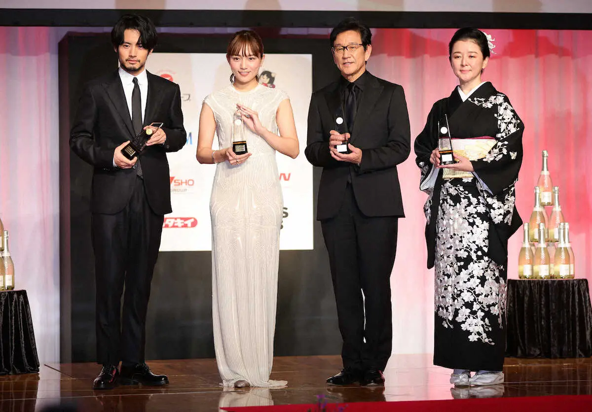 笑顔で写真に納まる(左から)赤楚衛二、川口春奈、栗山英樹氏、伊藤玄聖氏(撮影・白鳥 佳樹)