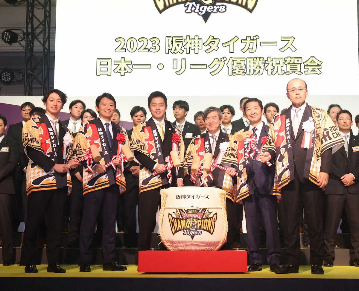 阪神は29日、「2023 阪神タイガース 日本一・リーグ優勝祝賀会」を大阪市内のホテルで行い、政財界を中心に招待された約500人が出席した。岡田彰布監督(66)は、圧倒的な勢いでセ界を制した今季レギュラーシーズンを「個人の成績は大したことない」と一刀両断。個々が今季以上の成績を残すことを心がけ、タイトルホルダーを増やすことが優勝を指す「アレ」と「連覇」を掛け合わせた「アレンパ」への近道と説いた。