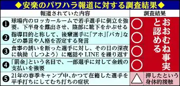 球団顧問弁護士の稲垣勝之氏とともに会見した森井球団社長は「アンケート結果をもとにヒアリングを実施し、照らし合わせた上で調査確認を慎重に進めて参りました。報道がなされていた事象が、ほぼ事実と判明しました」と話し、複数の若手選手が被害を訴えたパワハラについて「ほぼ事実」と認定。