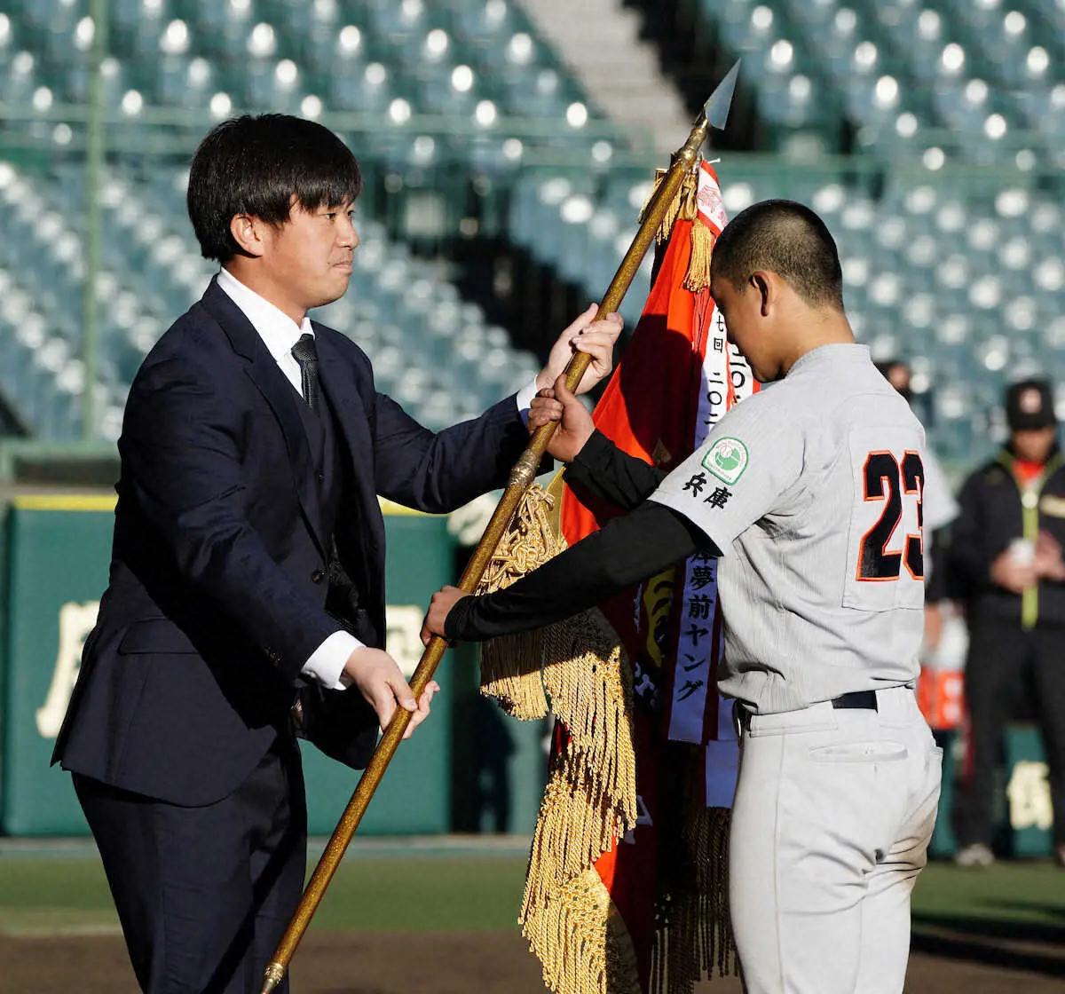 甲子園で行われたタイガースカップで兵庫夢前ヤングが優勝 阪神・桐敷が優勝旗を授与