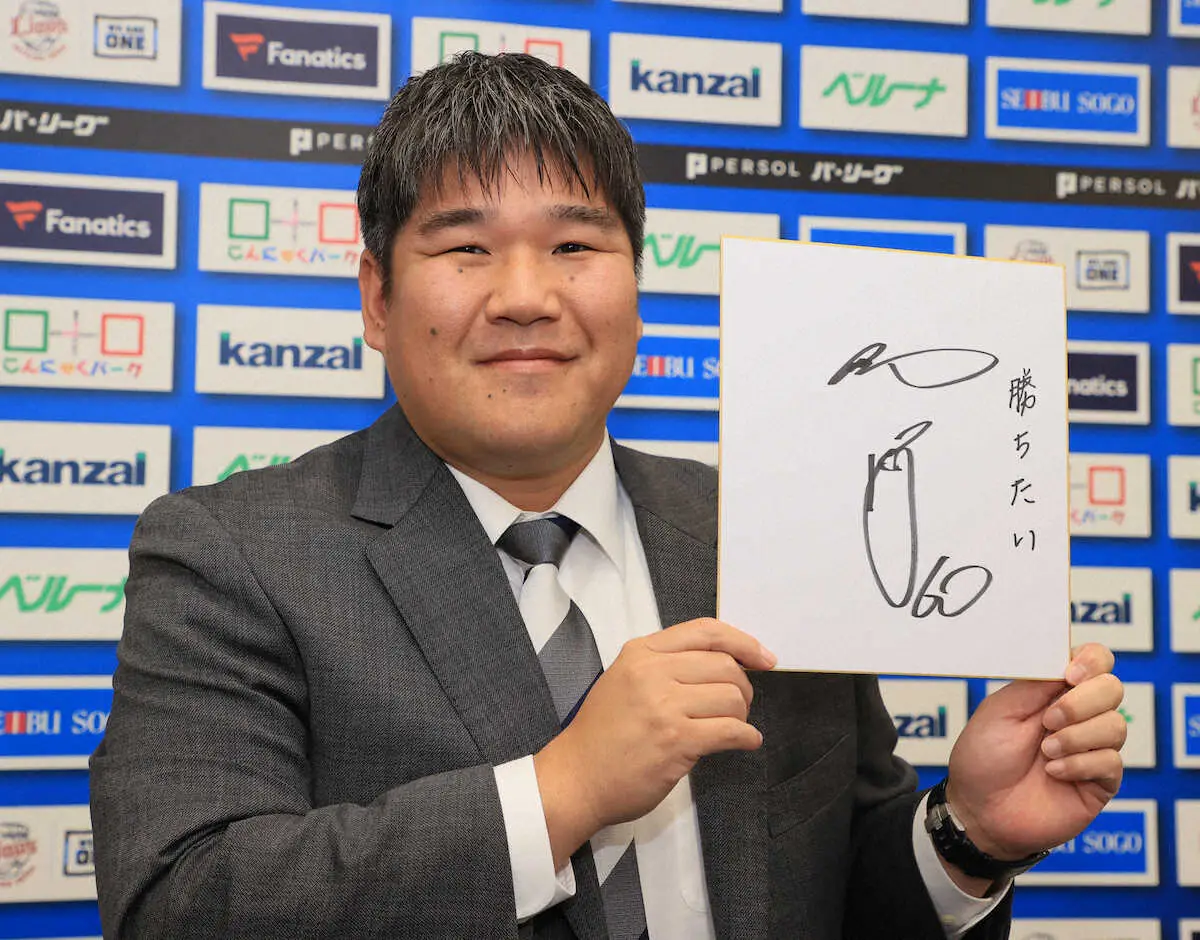 来季の目標を「勝ちたい」と記し笑顔を見せる中村(撮影・尾崎 有希)