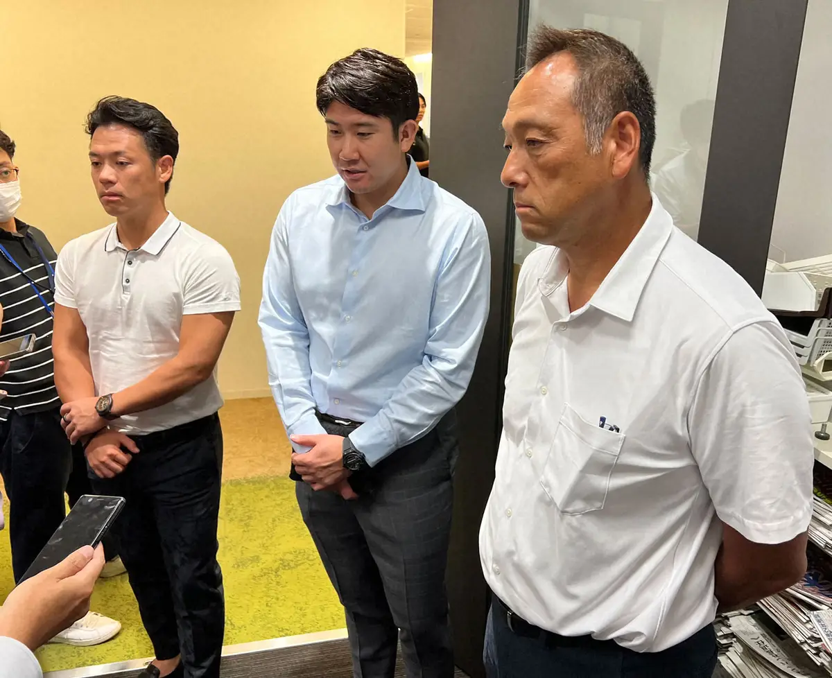9月にNPBを訪問した(左から)ヤクルト・小川、巨人・菅野、日本プロ野球選手会・森事務局長