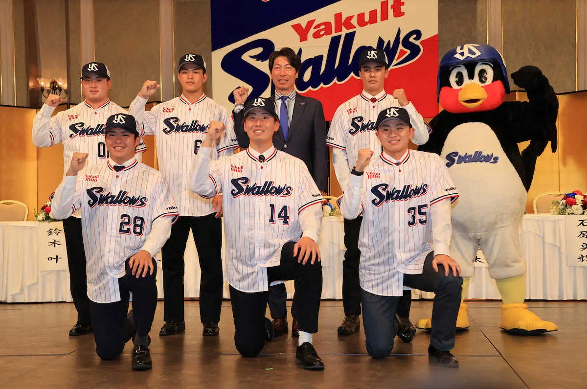 ヤクルトの新入団選手ら。(前列左から)松本、西舘、石原(後列左から)高野、鈴木、高津監督、伊藤、つば九郎(撮影・篠原岳夫)