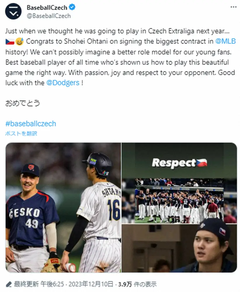 今年のWBCで対戦したチェコ代表オンジェイ・サトリア(左)からサイン入りユニホームを受け取った日本代表・大谷(サトリア提供) Photo by 提供写真 野球チェコ代表も大谷ドジャース移籍を祝福!「素敵な投稿」「ジョークも面… ギャラリーで見る この記事のフォト 2023年12月10日の画像一覧 もっと見る 2023年12月10日の画像をもっと見る