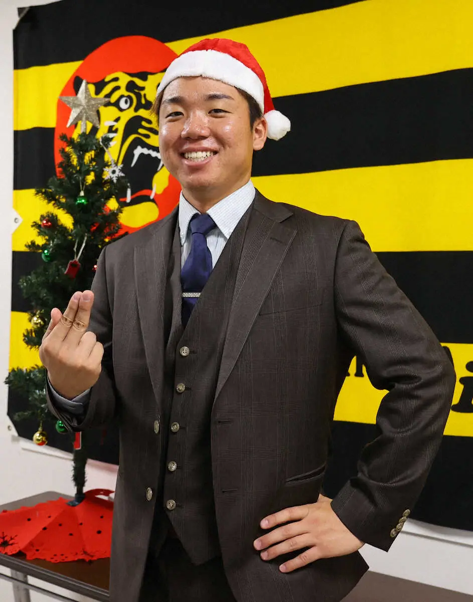 <阪神契約更改>球団史上最高アップ率で契約更改した村上がサンタ姿で淡路島ポーズを見せる(撮影・岸 良祐)