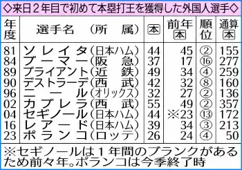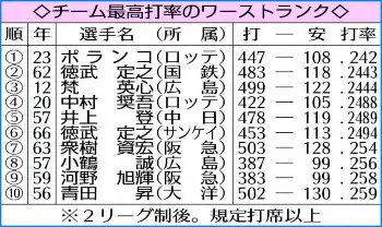 今季のポランコは本塁打の他、打率・242、75打点もチーム1位。ロッテ移籍1年目でチーム3冠王は毎日時代の50年別当薫(前年阪神)以来73年ぶり2人目だ。もっとも、規定打席以上のチーム最高打率としては62年徳武定之(国鉄)の・244を下回る2リーグ制後のワースト新記録になった。(記録課・宮入 徹)