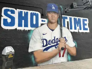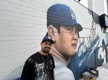 ドジャースタジアムから車で40分ほど南下した「ハーモサビーチ」の住宅街には1番打者のベッツと並んでドジャースのユニホーム姿の大谷の壁画が並んでいる。制作者で壁画アーティストのグスタボ・ゼルメノ・ジュニアさん(36)は「ドジャースと契約を結んだと知って、家主(店舗)に許可をもらって描いている。ワールドシリーズ優勝に導いて欲しいと願いを込めている」と笑みを浮かべた。