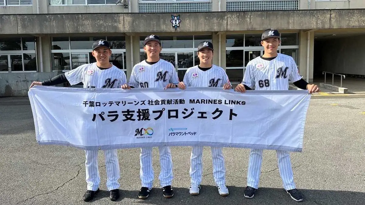 ロッテは18日午前、「パラ支援プロジェクト」の一環として、鈴木昭汰投手(25)横山陸人投手(22)友杉篤輝内野手(23)金田優太内野手(19)が千葉県我孫子市の湖北特別支援学校を訪問し、高等部151人を対象に野球体験型授業を実施した。