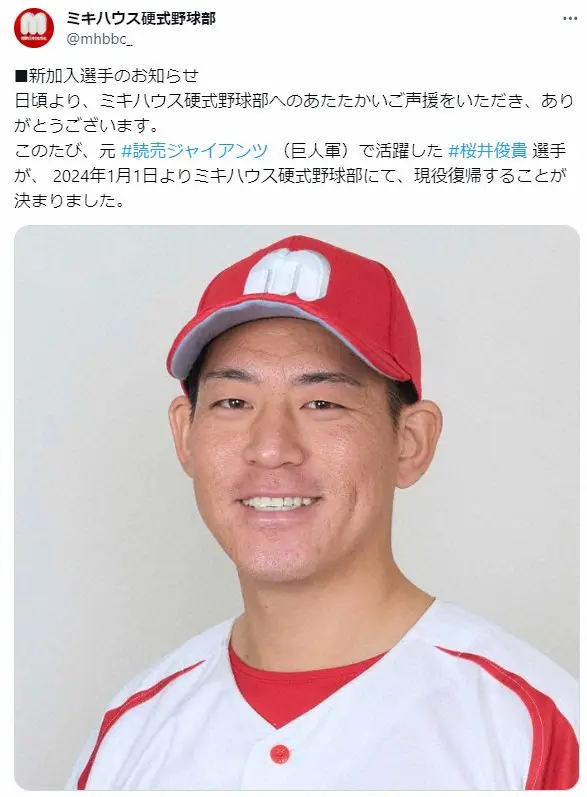 この日、ミキハウスは「このたび、元読売ジャイアンツ(巨人軍)で活躍した桜井俊貴選手が、2024年1月1日よりミキハウス硬式野球部にて、現役復帰することが決まりました」と発表。「桜井選手は、2022年現役引退後は読売ジャイアンツでスカウトを担当していましたが、再びマウンドに上がりたいという想いが高まり、ミキハウス硬式野球部の一員に加わることとなりました」とした。