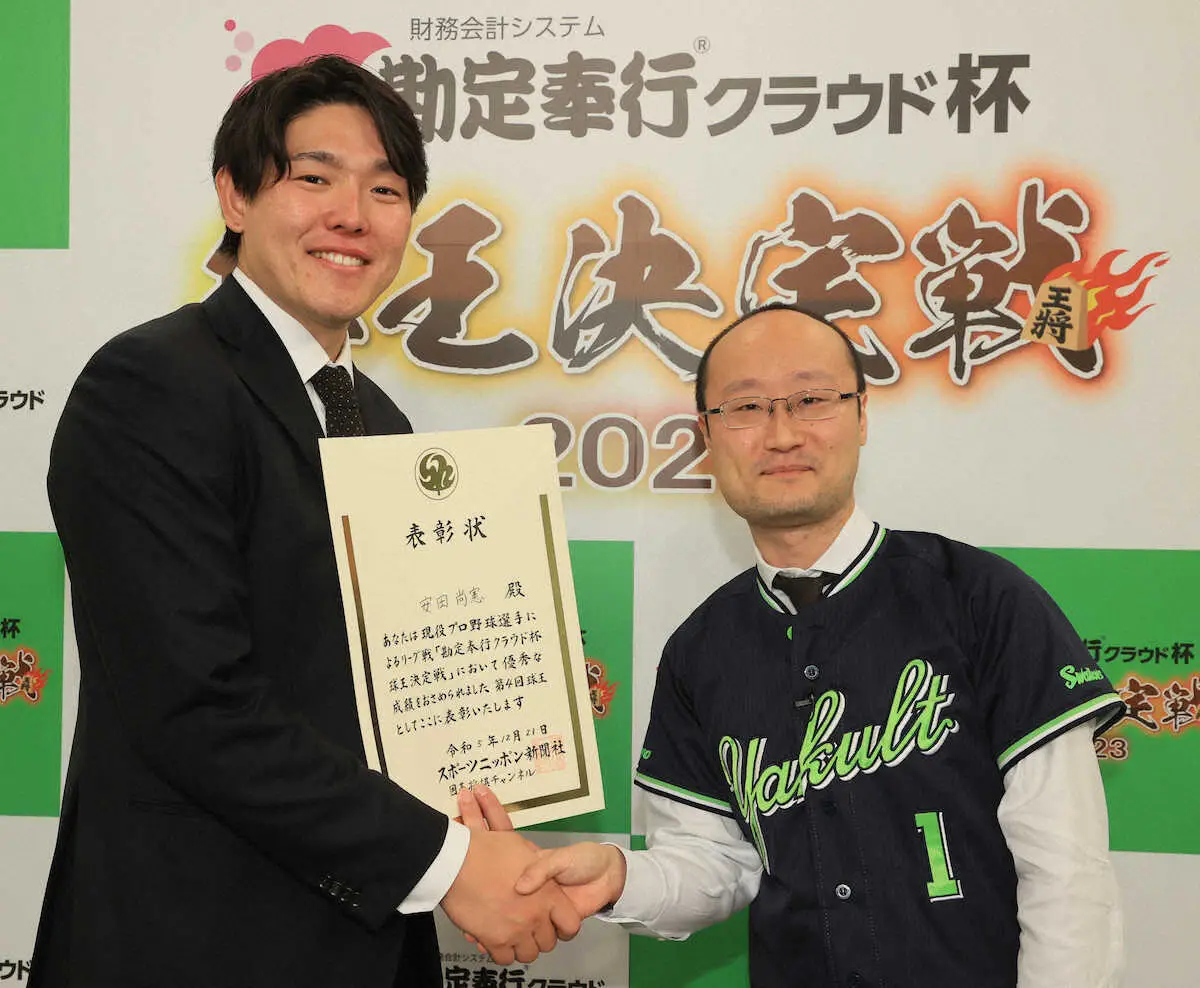 <勘定奉行クラウド杯球王決定戦>2連覇で球王に輝いたロッテ・安田は笑顔でポーズ(撮影・尾崎 有希) Photo by スポニチ 「球王」連覇のロッテ安田が渡辺明九段に惜敗 勘定奉行クラウド杯球王決… ギャラリーで見る この記事のフォト 2023年12月21日の画像一覧 もっと見る 2023年12月21日の画像をもっと見る
