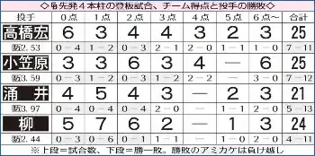 一方で投手陣は防御率3・08で阪神の2・66に次ぐリーグ2位と健闘するも、打線の援護が1試合あたり2・73得点と防御率を下回っては勝てない。あおりを食ったのが高橋宏、小笠原、涌井、柳の先発4本柱。4人が先発した95試合のうち、56試合あった2得点以下(無得点18試合を含む)で4人合計2勝39敗の大幅負け越し。結果、全員が2桁敗戦を喫した。中日でシーズン4人の2桁敗戦は73年以来50年ぶり6度目だが、全員10勝未満は初めてだ。