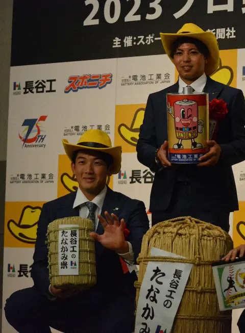 【記者フリートーク】11月27日に開催された「バッテリー賞」表彰式後の控室。DeNA・東が山本に「祐大そんなに乾電池いらないだろ。ウチは娘のおもちゃで使うから譲ってくれよ」と言うと、山本は「駄目ですよ。僕だって使うんですからね」と突っぱねた。2人には、副賞で一般社団法人電池工業会からそれぞれ乾電池320本が贈呈されていた。山本はそのとき、すでにプロポーズを終えており新婚生活に備えて「電池」のキープにこだわったのだろう。17日には、独身最後のイベントに三浦監督と東と参加。ファンから「今欲しいものは何?」と質問を受けると「炊飯器が欲しい。ちょっといいやつ」と答えた。これも2日後からスタートする新婚生活を意識した回答だった。会場は笑いに包まれたが、山本の目だけは真剣だった。
