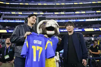 革ジャン姿の大谷は水原一平通訳、代理人のネズ・バレロ氏とグラウンドに現れると、ラムズの背番号「17」のユニホームを手にマスコットらと記念撮影。アメフトのボールを手にする場面やラムズの選手とがっちり握手を交わす場面もあった。