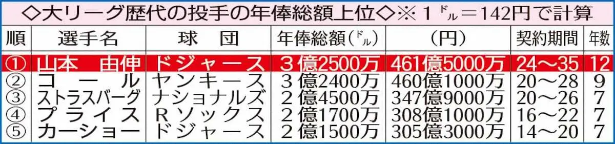 ◇大リーグ歴代の年俸総額の上位◇ Photo by スポニチ 山本由伸 ドジャースと12年462億円で契約合意 メジャー投手史上最長&最… ギャラリーで見る この記事のフォト 2023年12月23日の画像一覧 もっと見る 2023年12月23日の画像をもっと見る