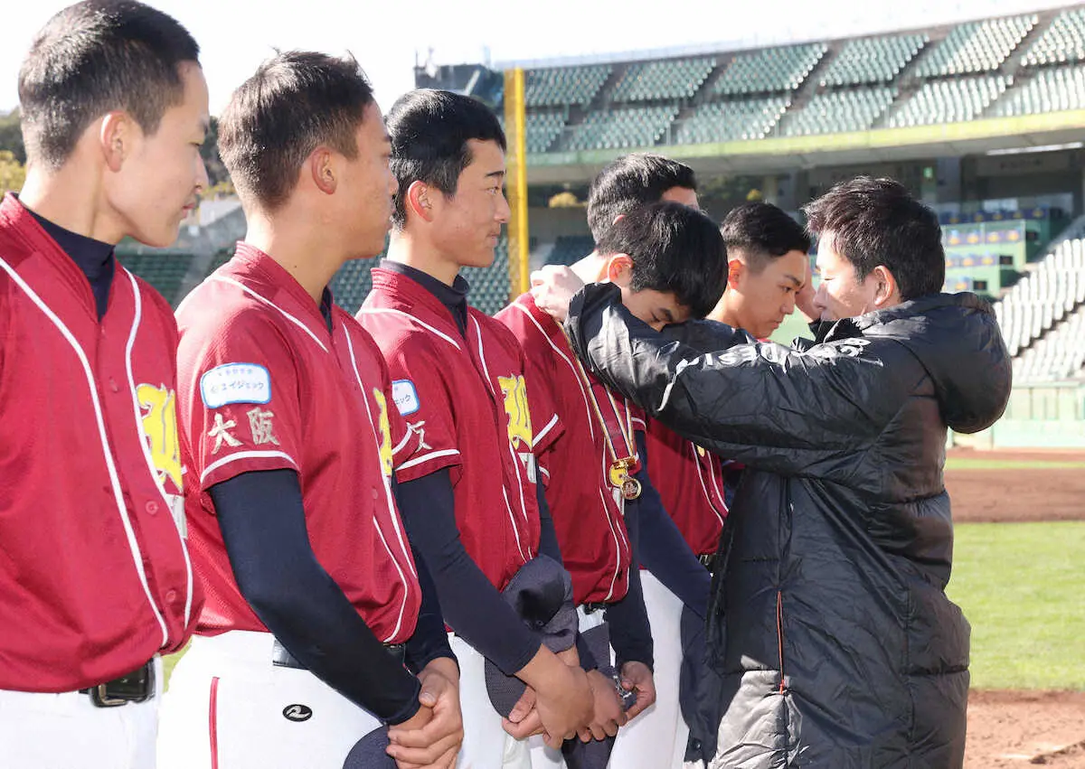 第17回レッドスターカップ2023<大阪交野リトルシニア・三州ボーイズ>優勝した大阪交野リトルシニアナインにメダルをかける赤星憲広氏(右)(撮影・平嶋 理子)