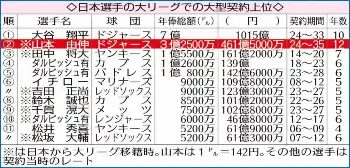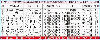 大谷と合わせて10億2500万ドル(約1476億5000万円=大谷は合意時の額)。ド軍は巨額投資で今オフのFA市場ランキング1、2位の両獲りに成功し、大リーグ公式サイトは「この冬のド軍にとって、もう一つの歴史的な契約」と伝えた。その山本獲得に大きな力を発揮したのが大谷だ。自身の巨額契約は後払いにし、補強のための予算枠に余裕を持たせた。球団へ「ぜひ山本を獲得してほしい」と進言。12日の面談にも同席、交渉後には会食もした。