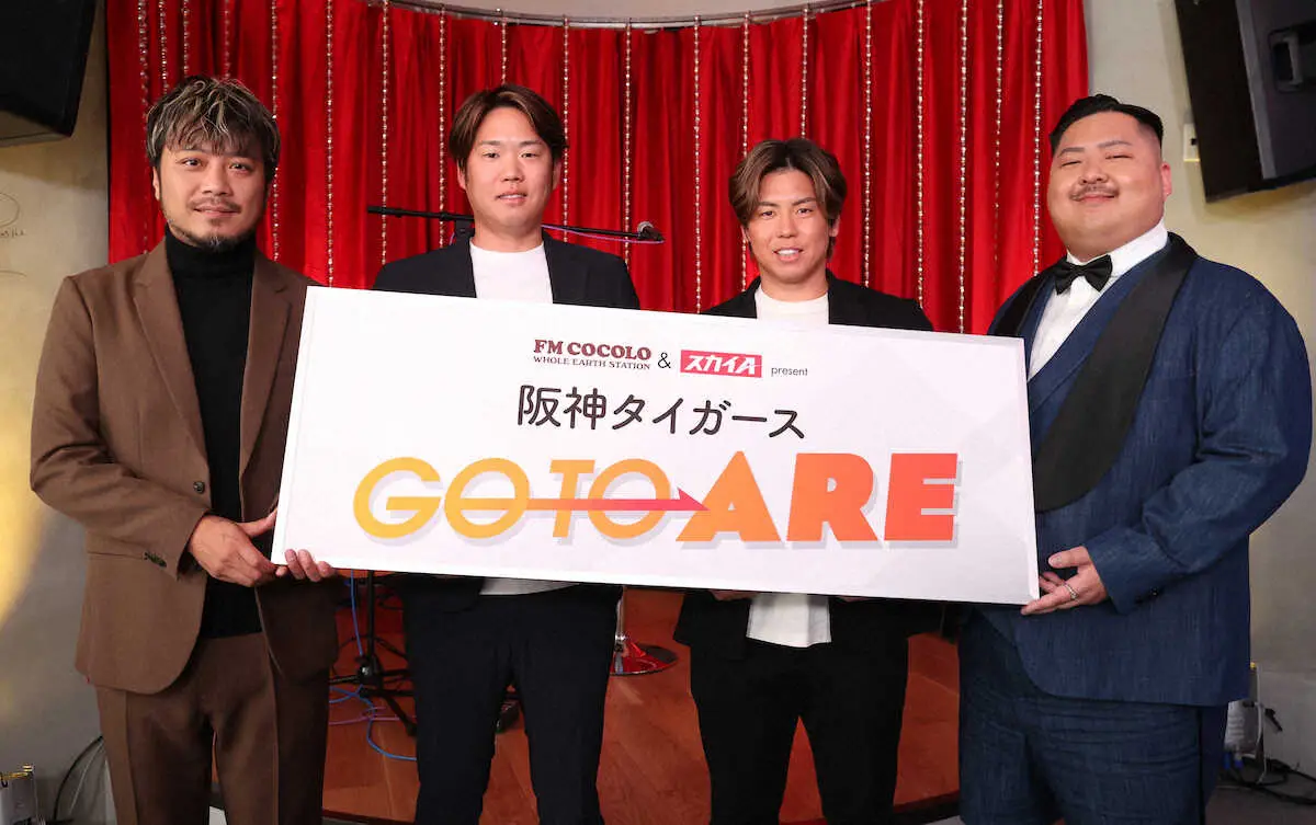 「FM COCOLO&スカイA present 阪神タイガース Go to ARE」の収録を行った西勇(中央左)と梅野(同右)。左は光永亮太、右はBigfumi(撮影・北條 貴史)