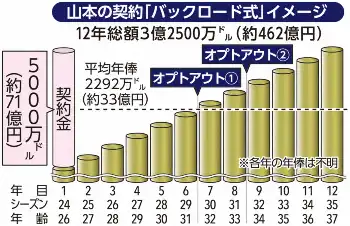 ≪オプトアウト権行使でオリックスへの譲渡金は減額≫山本が12年総額3億2500万ドルの契約を満了した場合は、オリックスへ5062万5000ドル(約72億円)の譲渡金が支払われるが、途中でオプトアウト権を行使し契約破棄する場合には譲渡金は減額となる。6年目オフと8年目オフに、山本自らの意思で契約解除ができる。現時点ではいくらになるのかは不明だが、仮に6年目オフに契約解除した場合には、そこまでの支払総額に応じて譲渡金が算出される。