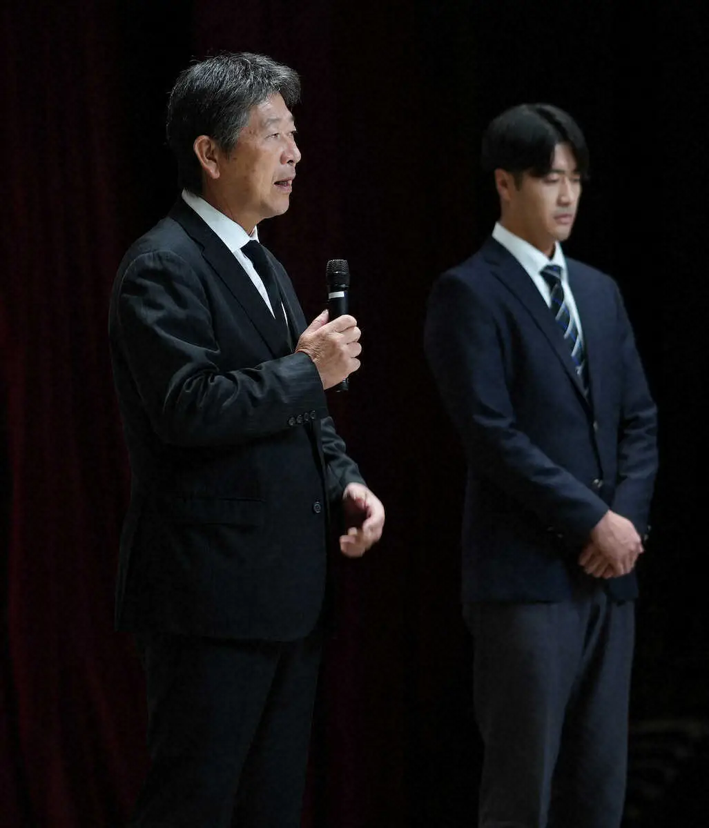 巨人からドラフト1位指名を受けた中大・西舘の入団祝賀会が、岩手県花巻市内で行われ、中大の清水達也監督が教え子たちによる日本一に期待を込めた。