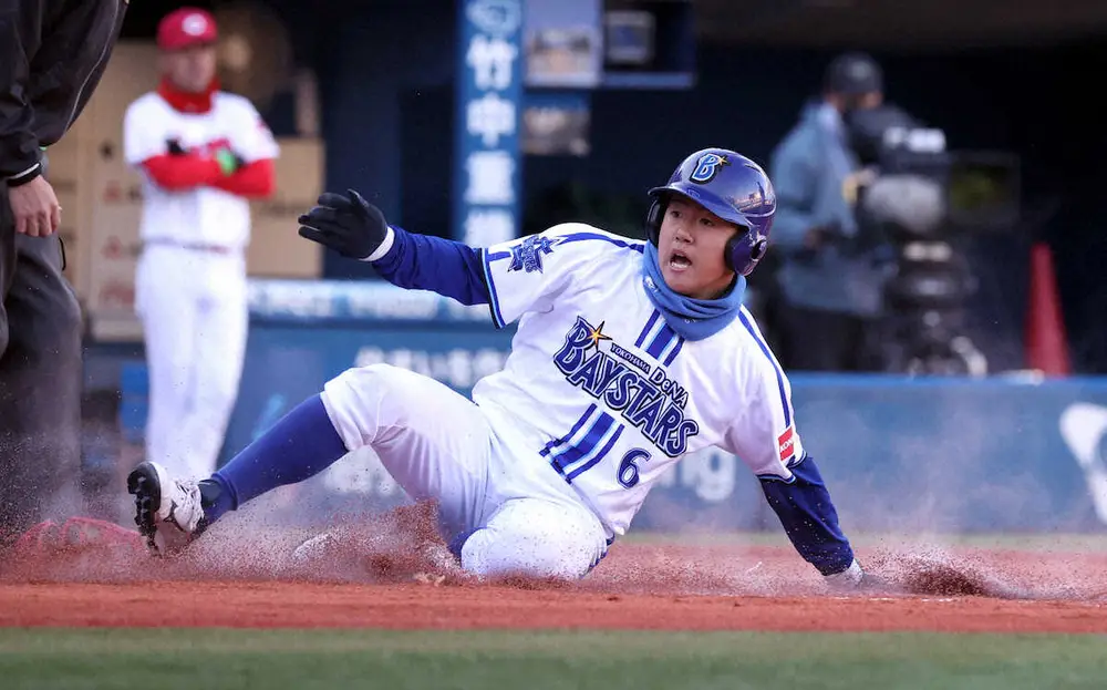 下手投げの広島・藤井の浮き上がるボールに父親譲りの粘りを見せ、3―1から5球連続ファウル。10球目の111キロ直球に食らいついて、二塁手が背走しながら伸ばしたグラブの先に打球を落とした。快足を飛ばして二塁まで進むと、直後の三失で三塁に進塁。二ゴロの間に生還して先制のホームを踏んだ