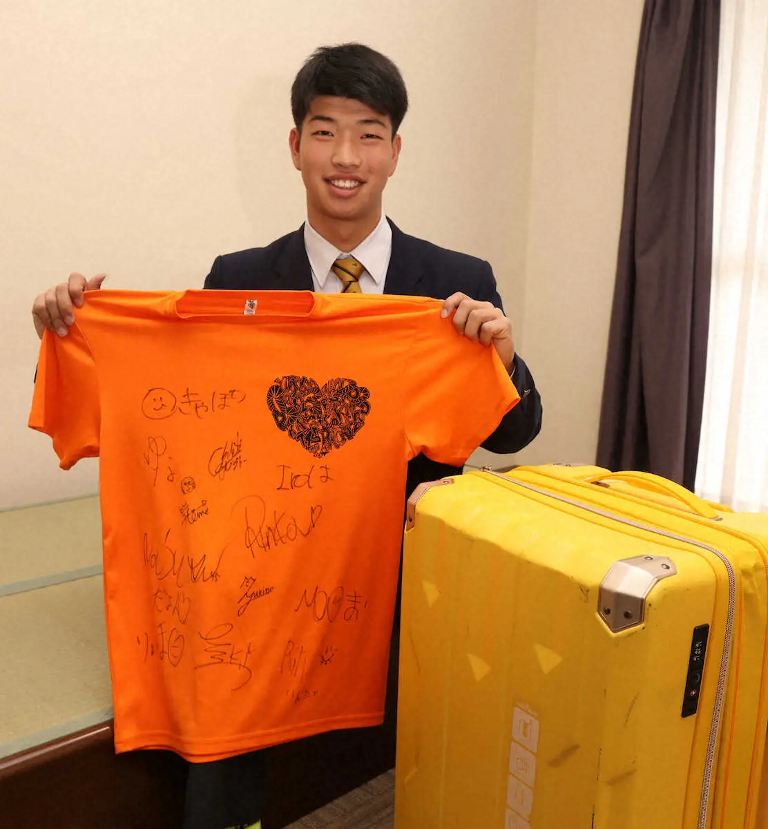 ドラフト4位・百崎(東海大熊本星翔)は約20人のクラスメートのサインが書かれたTシャツを持参した。「クラスメートは、そんなに多くないと思うので、仲間を大切にして、少しでも早く活躍できるように」と聖地での“恩返し”を誓った。中学時代から愛用する黄色のキャリーバッグも映え「(阪神入団を機に)買っただろ、と言われる」と苦笑いで“否定”。いよいよ始まるタテジマでのプロ生活へ向け高校通算39発を誇る大砲候補は「ここから頑張っていきたい」と言葉に力を込めた。