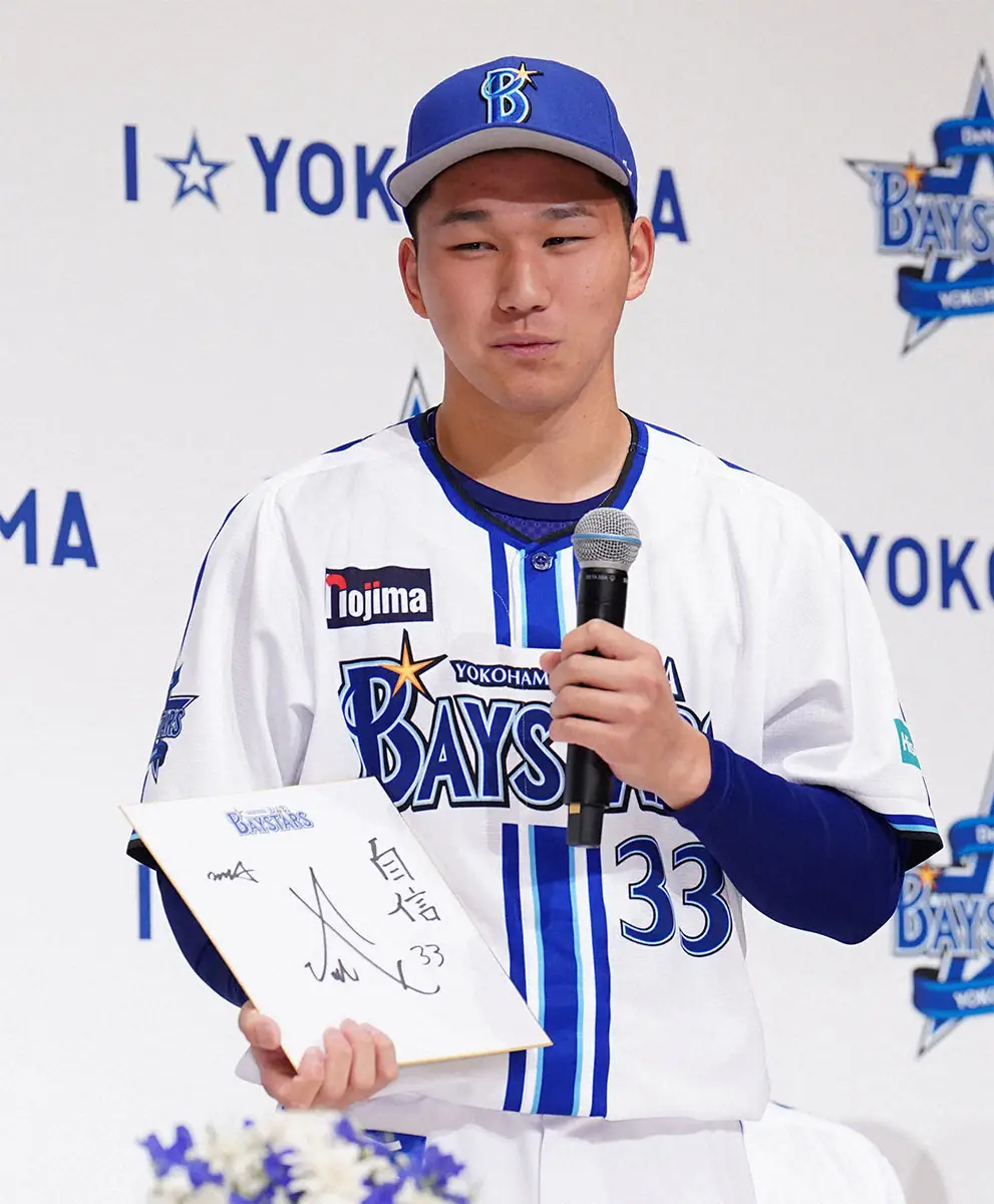 8日の新人合同自主トレ初日から野手組で汗を流すが「メニューをやり切っていく。どっちの立場で練習しても全力でやっていきたい」。投手用のグラブも持参し、来たるべき日に備えている。打撃練習は1位指名の度会(ENEOS)とペアを組むが「見とれていても集中できない。しっかり集中して」と苦笑いしていた。