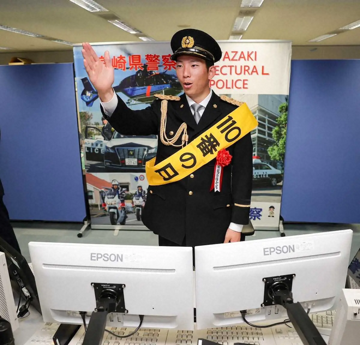 110番通報が飛び交う緊迫した空気を肌で感じた。人生で初めて警察官の制服に袖を通した戸郷は、通信指令室でリアルを目撃。「独特な雰囲気。ドラマでしか見たことない、体験したことのないような緊張感」とマウンドとは別物の環境を体感すると、「110番」にかけて、今季中の通算「100登板」到達を宣言した。