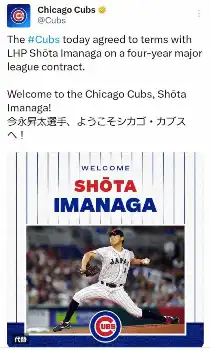 カブス、今永獲得を正式発表 背番号は「18」 13日に本拠地シカゴの高級ホテルで入団会見