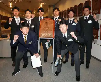 野球殿堂博物館を見学し、ランディ・バース氏のレリーフを囲み記念撮影する下村海翔(後列右から2人目)ら阪神の新人選手たち