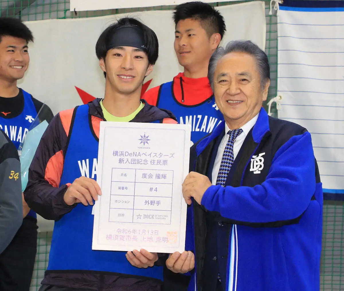 DeNAのドラフト1位・度会隆輝外野手(21=ENEOS)ら新人11選手が13日、神奈川・横須賀市の選手寮を兼ね備えた球団施設で「新入団選手歓迎式」に出席し、上地克明市長から住民票を受け取った。度会は「今年から横須賀市民。横須賀を盛り上げられるように頑張る」と約束。昨年まではENEOSの寮がある神奈川県川崎市の市民だった。