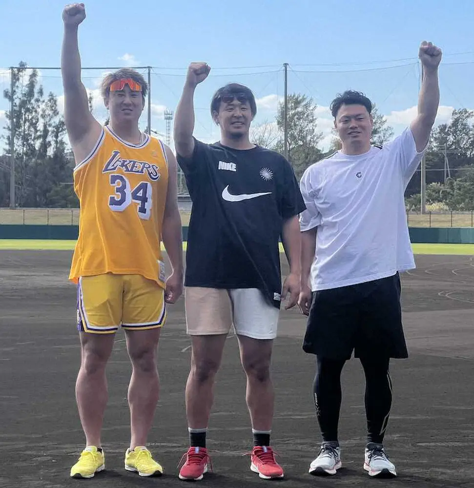 沖縄県内で自主トレを公開し、昇天ポーズをする(左から)オリックス・杉本、楽天・浅村、中日・細川(撮影・花里 雄太)