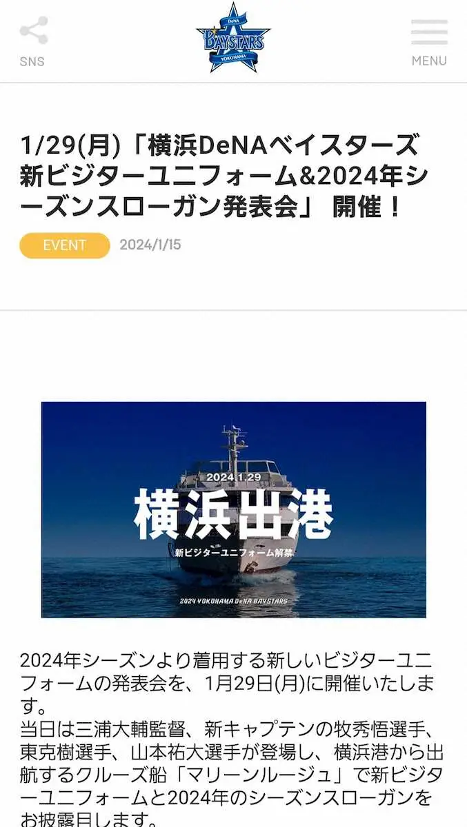 横浜出港!DeNAが29日に船上でビジターユニホームとスローガン発表会 チケット抽選受付は22日まで