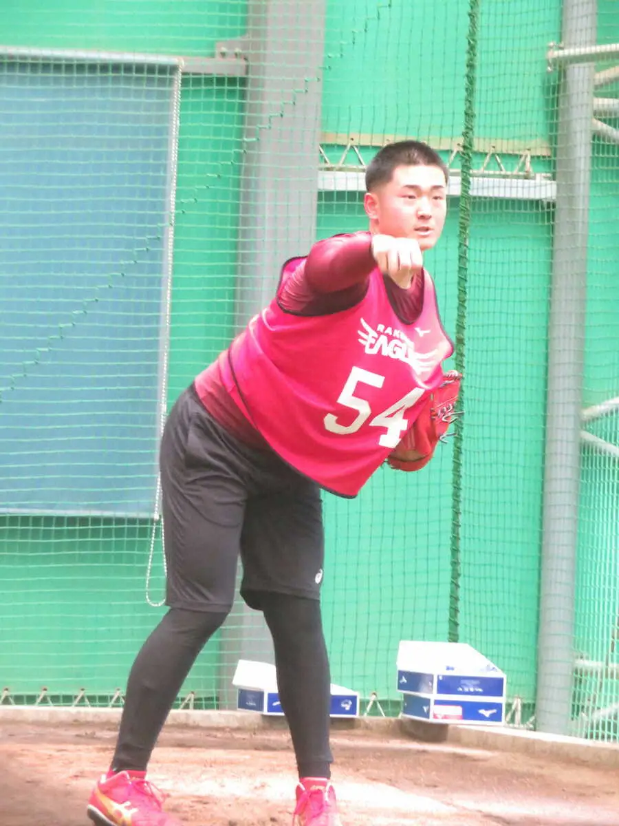 新人合同自主トレで早くも3度目のブルペンに入った楽天ドラフト3位・日当。前日散髪した丸刈り姿が初々しい