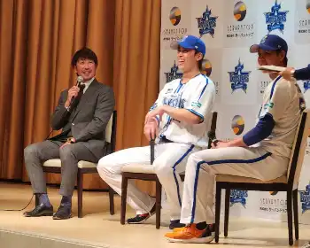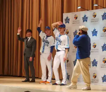 「ハマの爆笑王」ことDeNA・入江大生投手が21日、平良拳太郎投手、藤田一也育成野手コーチとともに横浜市内でトークイベントを開催。2308組の応募の中から抽選で選ばれた150組、300人のファンを軽妙なトークなどで沸かせた。