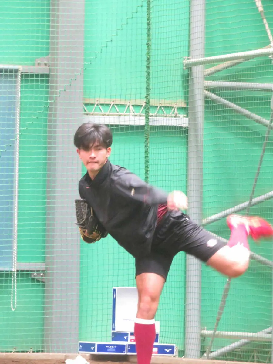 最速153キロ左腕の楽天1位・古謝(桐蔭横浜大)が仙台市の2軍施設で行われた新人合同自主トレで、4度目のブルペン入り。