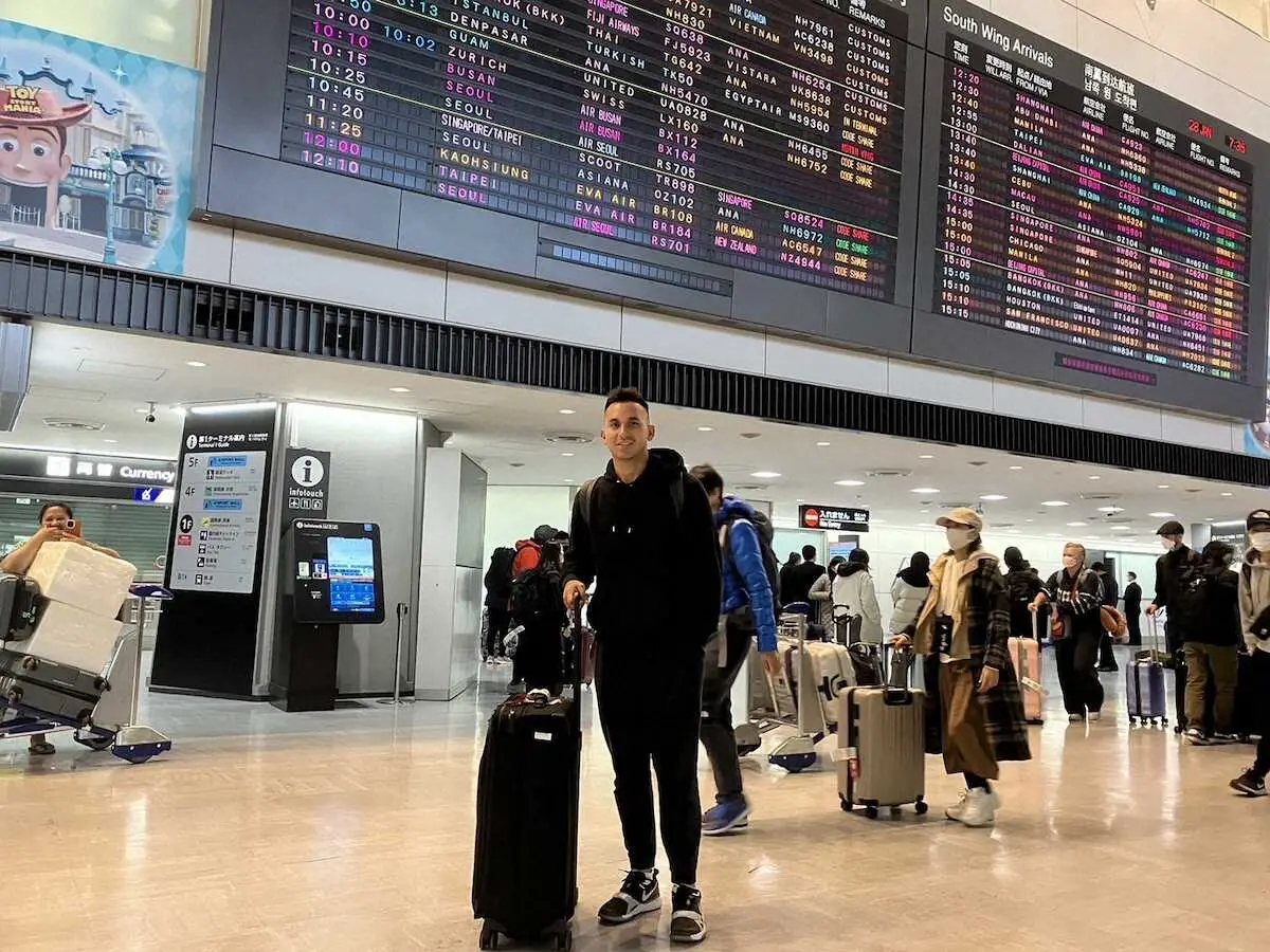 成田空港経由で関西国際空港に午前に到着。最速164キロを誇り、救援候補として期待される。球団を通じて「ようやく日本に来ることができてうれしいです。もう自分の家にいるような感覚ですし、これから新しい仲間たちやファンのみなさんと会えることを凄く楽しみにしています」と心境を明かした。