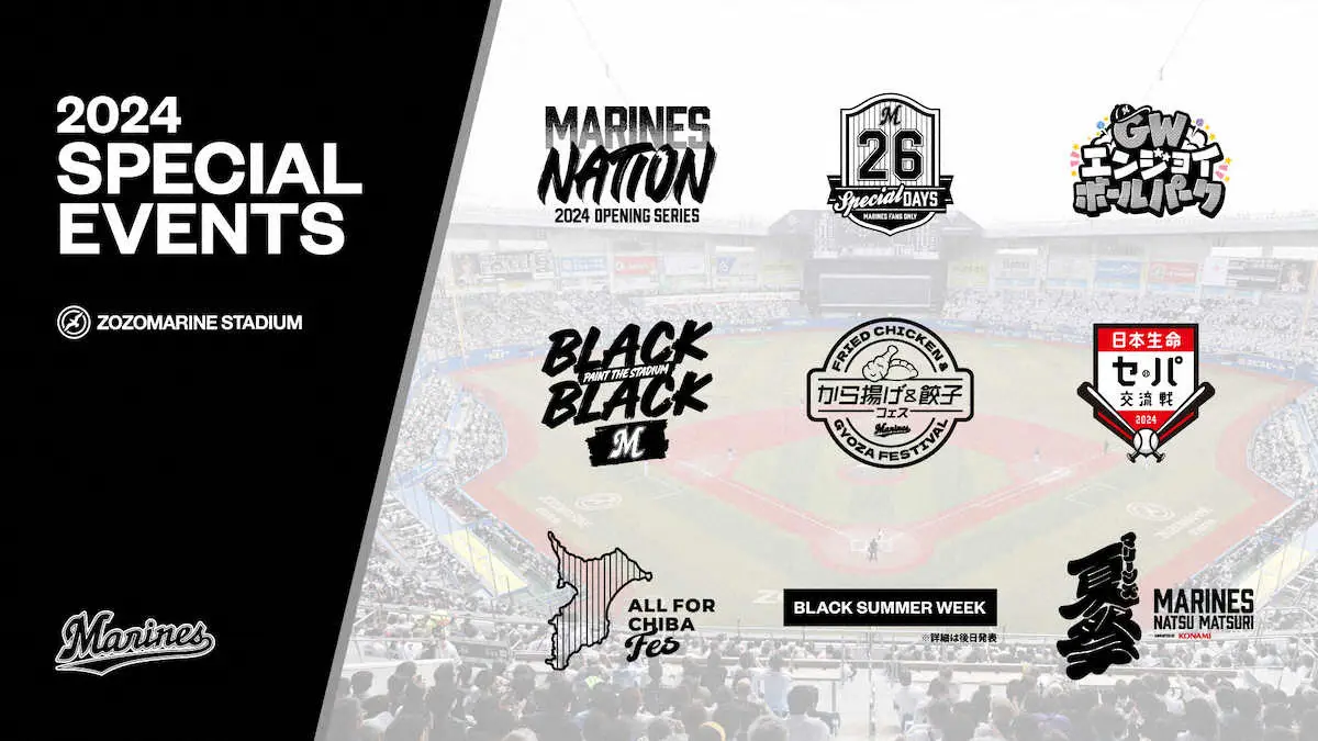 2024年シーズン開幕となる3月29~31日の日本ハム戦で「2024 OPENING SERIES MARINES NATION」を開催。「TEAM26 Special DAYS」を4月5~7日のオリックス戦、「GWエンジョイボールパーク」を4月27~29日の楽天戦、「BLACK BLACK」を5月17~19日の日本ハム戦、「から揚げ&餃子フェス」を5月24~26のソフトバンク戦で開催する。なお、5月24日はビール半額デーを実施する。